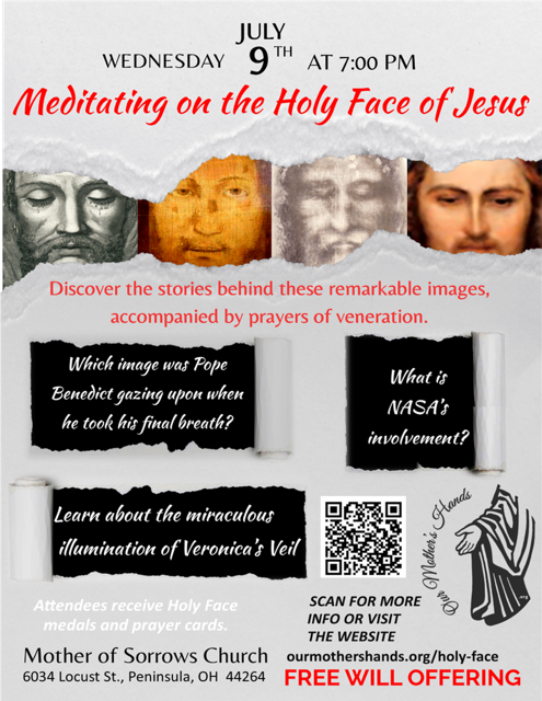 7/9 - Meditating on the Holy Face of Jesus- about 75 faithful people from parishes across Summit, Stark, and Cuyahoga Counties filled our church's pews at to hear Rosemary Reed from Our Mother’s Hands deliver a most interesting and enlightening presentation on various relics depicting the Sacred Faces of Jesus the church holds dear, including Veronica’s Veil, the Shroud of Turin, the Veil of Manoppello, and the Divine Mercy painting. It was indeed a special evening of information, stories and science for all who attended. We are grateful for Our Mother’s Hands and Rosemary for making such a wonderful presentation available to us. For more information, click here.